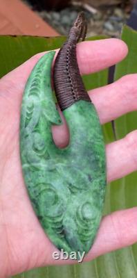 HUGE N JERRY INANGA POUNAMU GREENSTONE FLOWER JADE ENGRAVED MAORI HEI MATAU HOOK. STUNNING HUGE ONE OF KIND GEM GRADE MAORI BOUND HEI MATAU FISH HOOK CARVED FROM PEPPERMINT GREEN NZ INANGA POUNAMU GREENSTONE FLOWER JADE. Nathan is a greatly admired carver in New Zealand and his work is much respected by other jade artists.