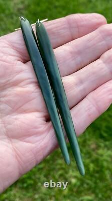 OMNI CAEON 4####x201D; NZ M#####x100;ORI KAHURANGI POUNAMU GREENSTONE JADE CLOAK PIN EARRINGS. SUPERB FLAWLESS RICH LEAF GREEN NEW ZEALAND MAORI KAHURANGI POUNAMU GREENSTONE JADE 4####x201D; AUREI CLOAK PIN EARRINGS EXPERTLY CARVED BY LEGENDARY NEW ZEALAND MASTER CARVER PREM OMNI CAEON. Omni was taught by iconic NZ carver Donn Salt, who was the first to carve an NZ jade triple moebius. These stunning earrings are completely one of kind, rich green, ######xA0; with gorgeous translucence, perfectly finished with a tactile, silky gloss glow and measure 4####x201D; long from the jump ring with beautifully rounded depth. ######xA0; Striking and unique wearable art.