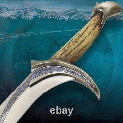 Shaped from the tooth of a dragon, the hilt's unique design is emblematic of the sword's legendary origins, possibly connected to the lore of Ecthelion of the Fountain. Comes complete with a wooden wall display and a certificate of authenticity, making it a perfect showpiece for collectors and fans of The Hobbit and Tolkien's universe.