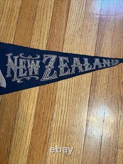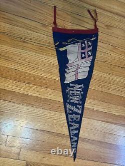 Early 1900 Vintage Felt Pennant, New Zealand in white lettering to the right of the New Zealand Flag on dark blue backgrounds Red Border on left 29"x11".